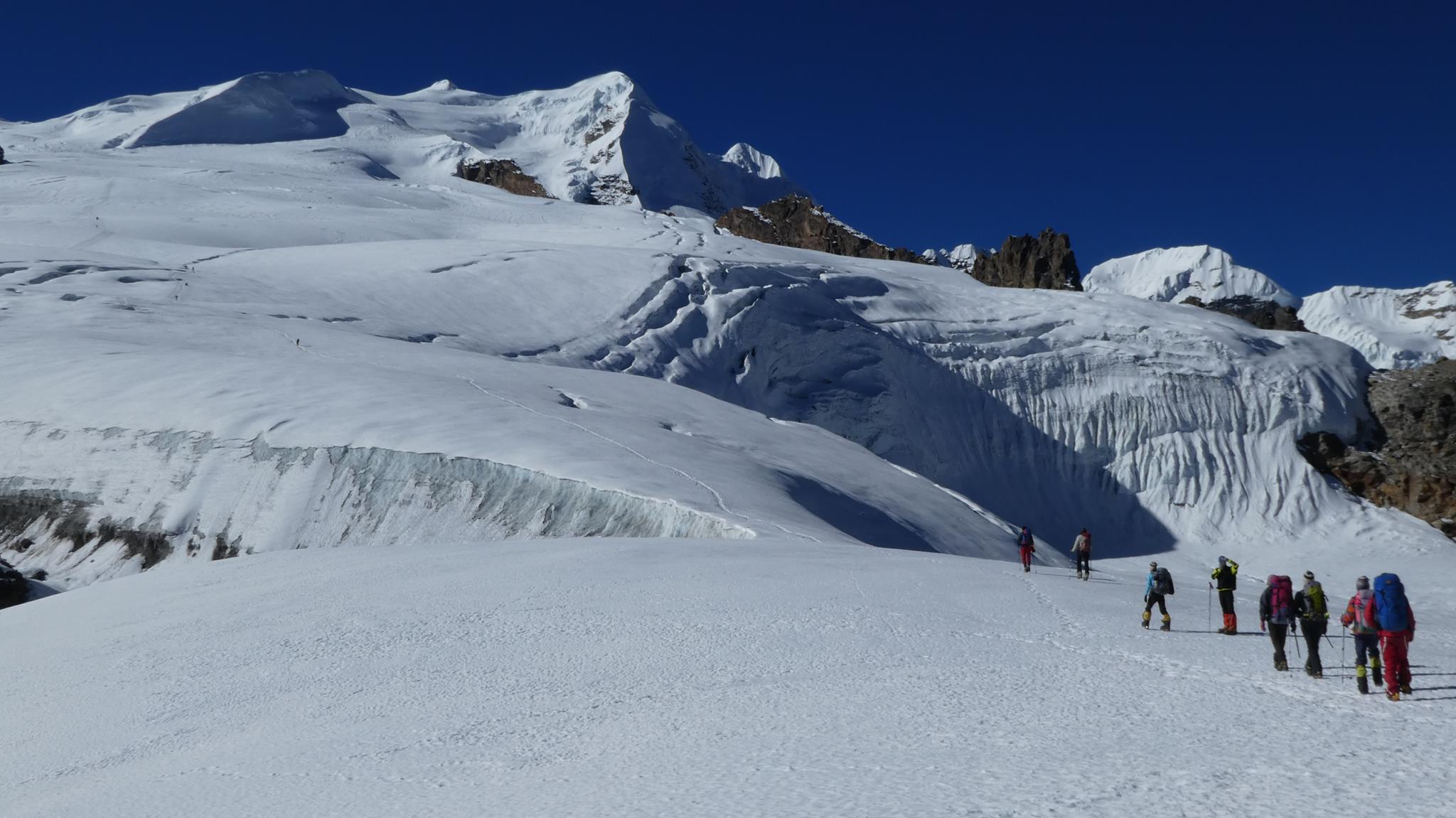 We trek along a steep, boulder-strewn trail to reach Mera Peak Base Camp, then continue through the Mera La Pass toward Mera High Camp. The route follows a rocky path that can be challenging and hazardous after fresh snowfall due to the presence of crevasses. After ascending to the top of the rock band, marked by a large cairn, we set up our high camp, taking in spectacular views of Mt. Everest, Makalu, Cho Oyu, the south face of Lhotse, Nuptse, Chamlang, and Baruntse. Overnight at Mera High Camp.